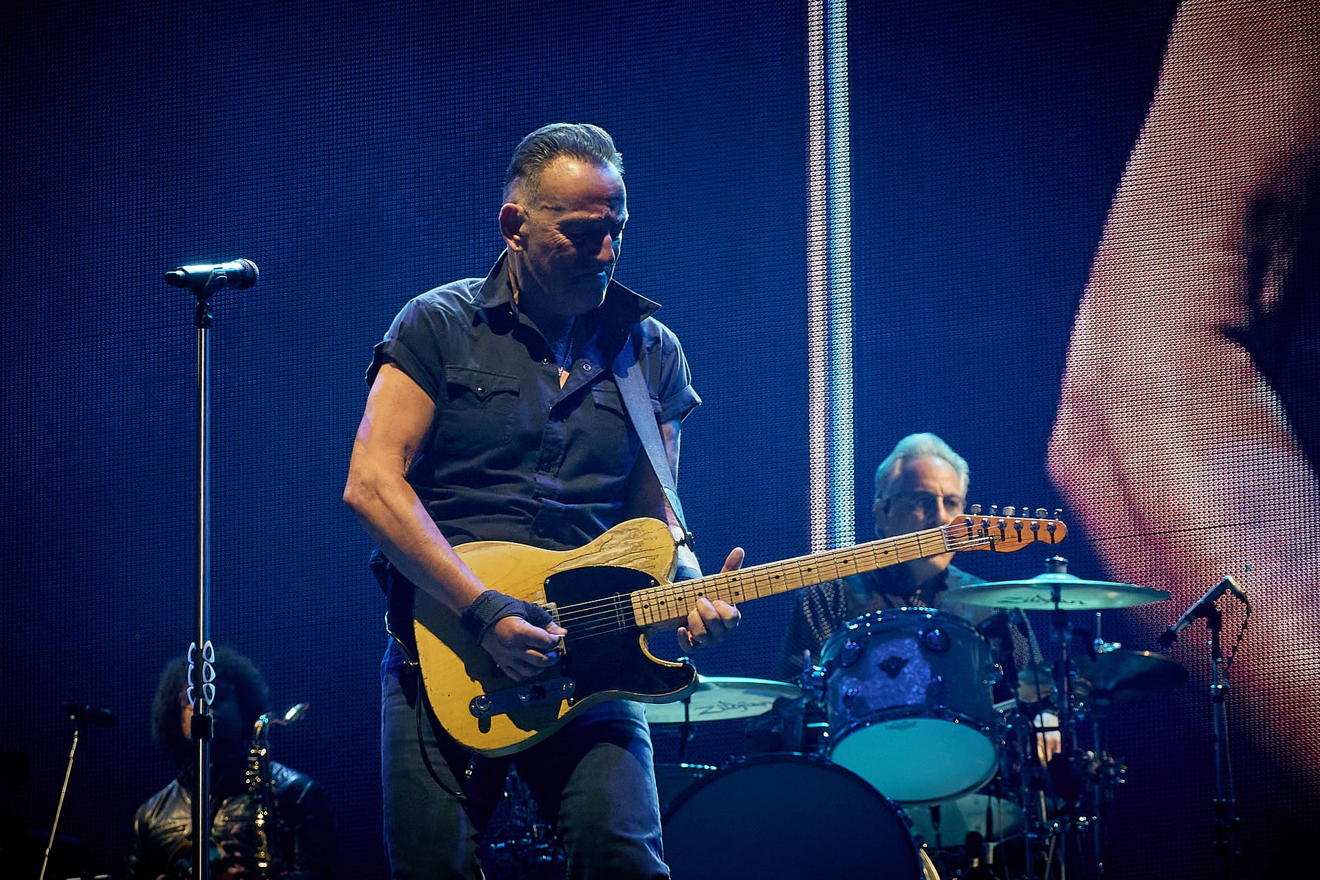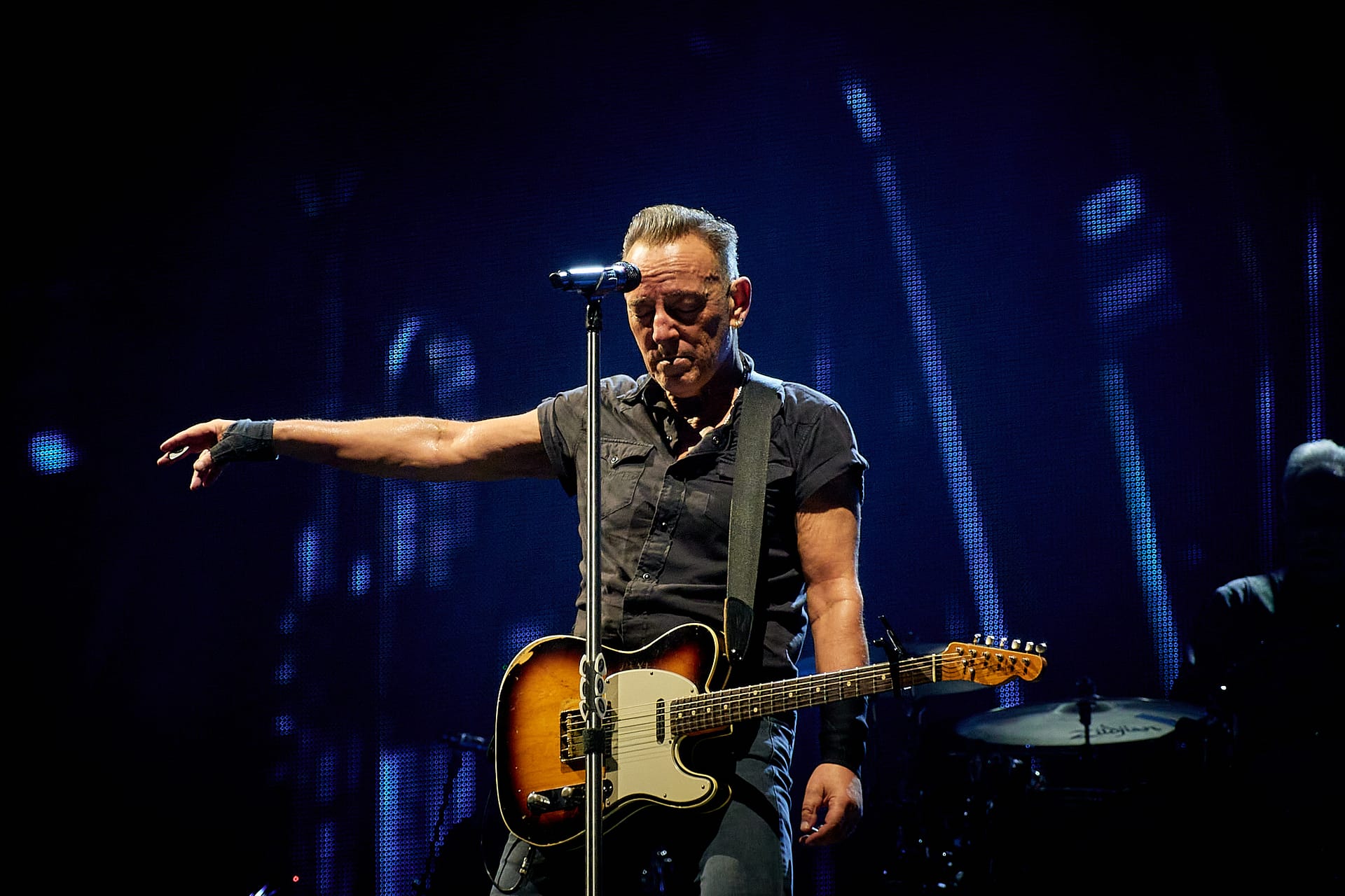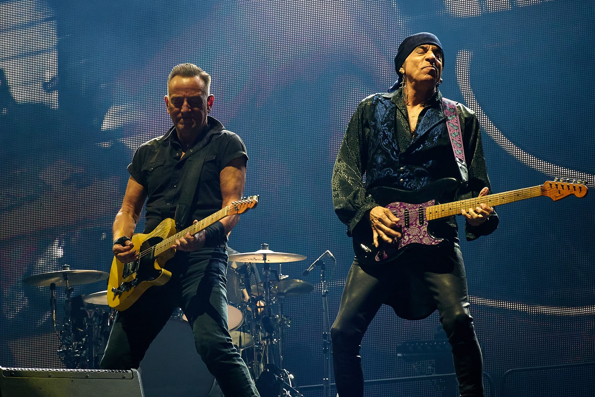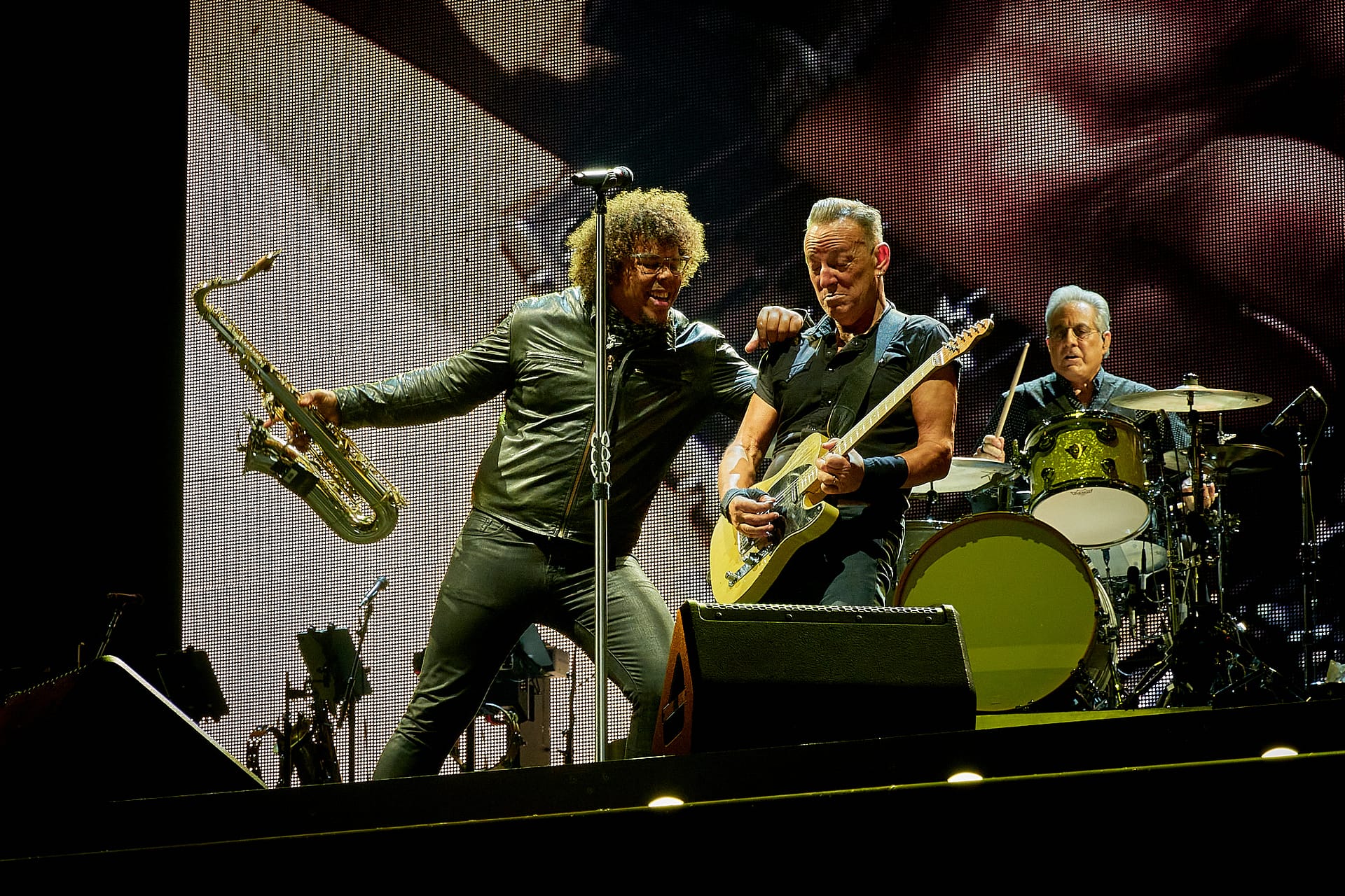 Sesión de fotografía durante el concierto de Bruce Springsteen en Barcelona el 30 de abril de 2023 con la icónica imagen de Bruce con el rosario que alguien del público le regaló colgado del bolsillo de su pantalón.